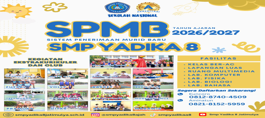 Keluarga Besar SMP Yadika 8 mengucapkan "Selamat Hari Raya Idul Fitri" 1 Syawal 1447 Hijriah Minal aidin wal-faizin, mohon Maaf Lahir dan Batin Semoga seti